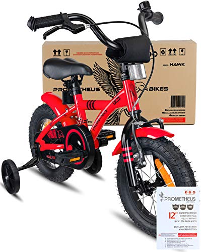 Título: Prometheus Bicicleta Infantil | 12 Pulgadas | niño y niña | Rojo Negro | A Partir de 3 años | con ruedines y Freno de contrapedal | 12" Modelo BMX 2019